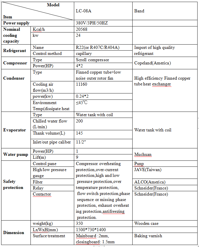 1.The cooling capacity is based on: chilled water inlet and outlet water temperature 12 ° C / 7 ° C, cooling inlet and outlet water temperature 30 ° C / 35 ° C