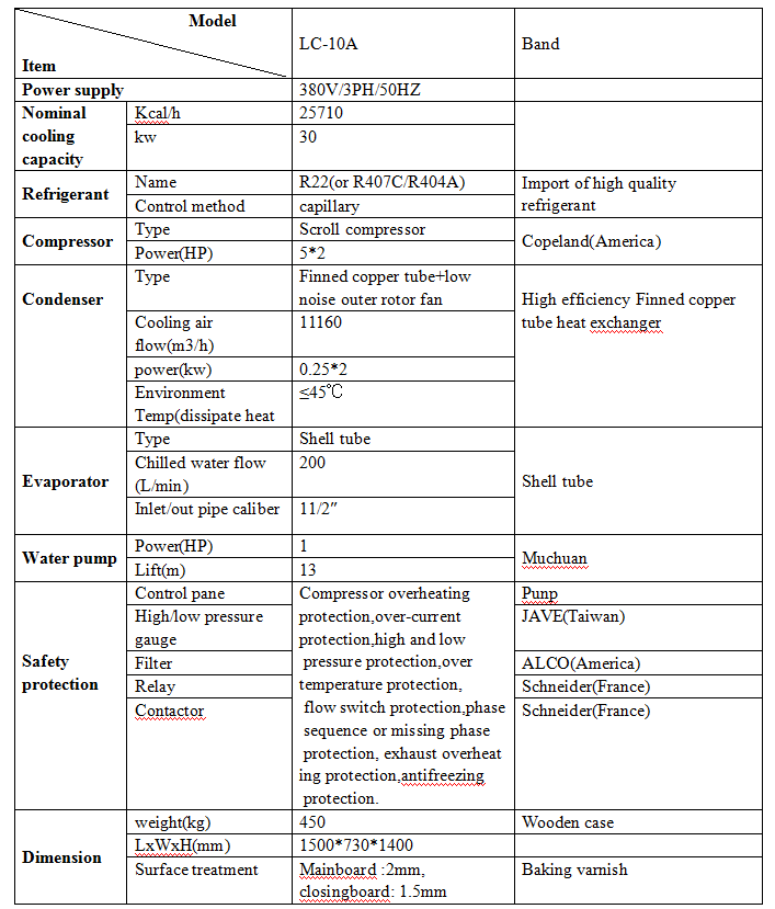 1.The cooling capacity is based on: chilled water inlet and outlet water temperature 12 ° C / 7 ° C, cooling inlet and outlet water temperature 30 ° C / 35 ° C