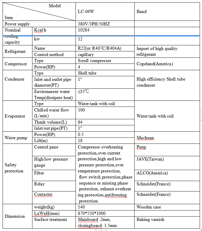 1.The cooling capacity is based on: chilled water inlet and outlet water temperature 12 ° C / 7 ° C, cooling inlet and outlet water temperature 30 ° C / 35 ° C